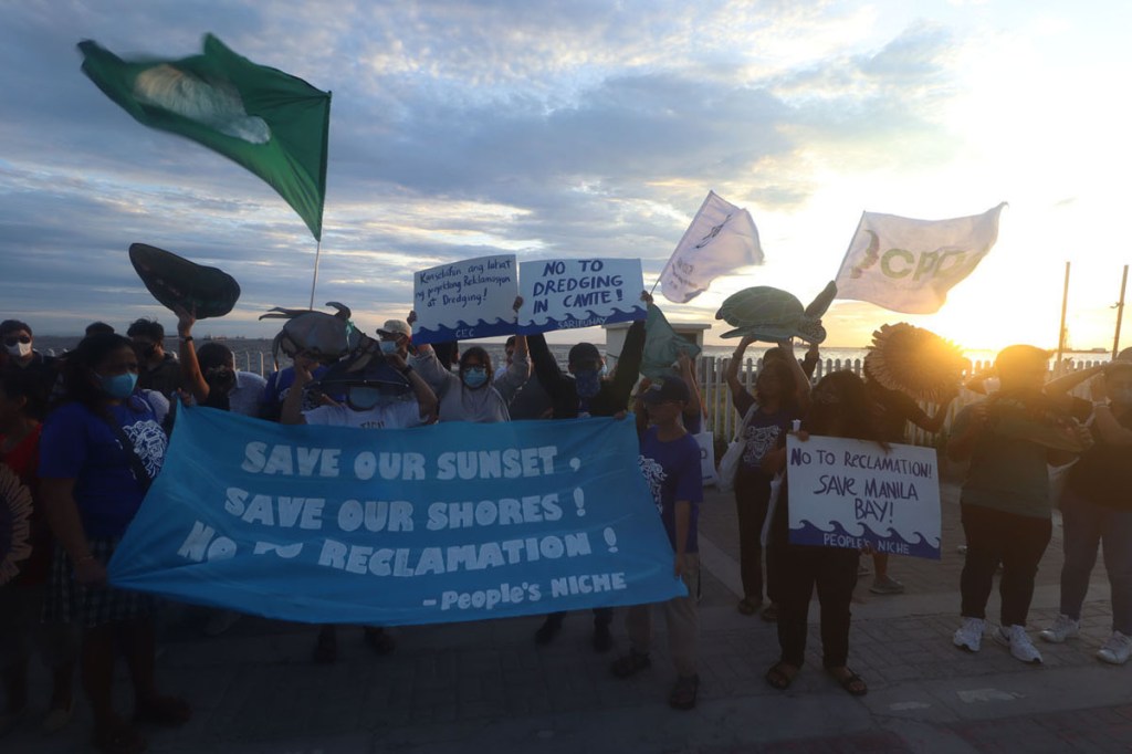 Environmental advocates, civil society groups, and concerned citizens held a “Manila Bay Sunset Action” protest rally along Roxas Boulevard, June 3, 2023. The groups call on the government for a stop to ongoing and proposed reclamations in Manila bay and other parts of the country which they say would harm the environment, affect livelihood of fishing communities as well as debase the cultural importance of the renowned Manila Bay sunset.