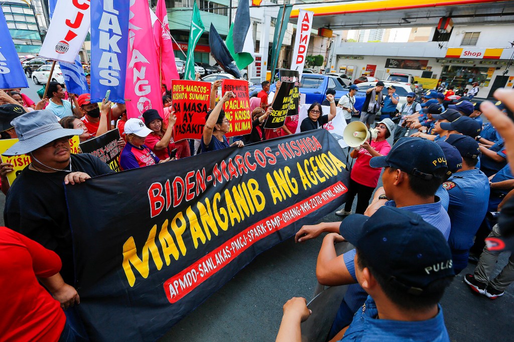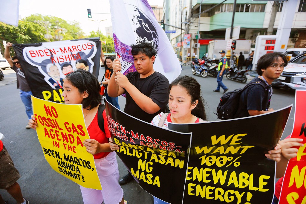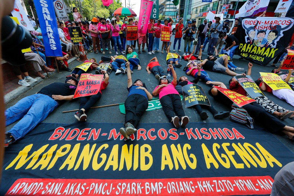 Climate advocates stage a protest near the US embassy in Manila on April 11, 2024, ahead of the trilateral meeting of US President Joe Biden, Japanese Prime Minister Fumio Kishida, and Philippine President Ferdinand Marcos, Jr. in Washington D.C.