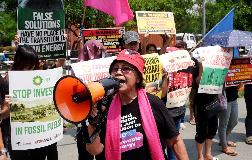 Filipino climate advocates stage a protest in front of the Japan Embassy in Manila, Philippines June 3, 2024, urging the Japanese government to “undertake drastic measures to rapidly phase out fossil fuel investments in Asia”.
