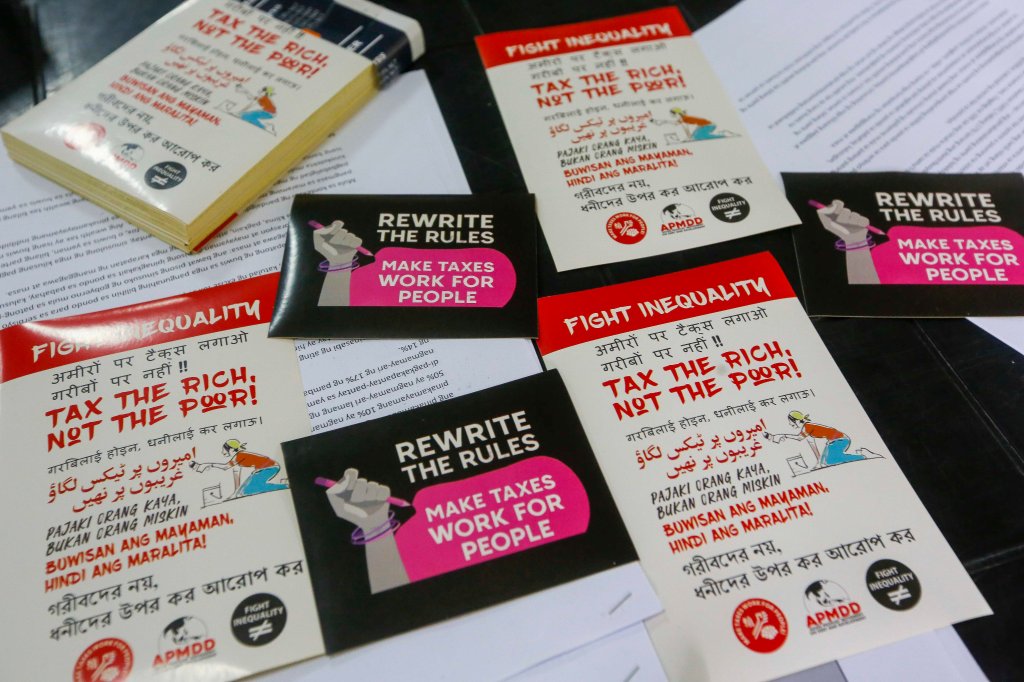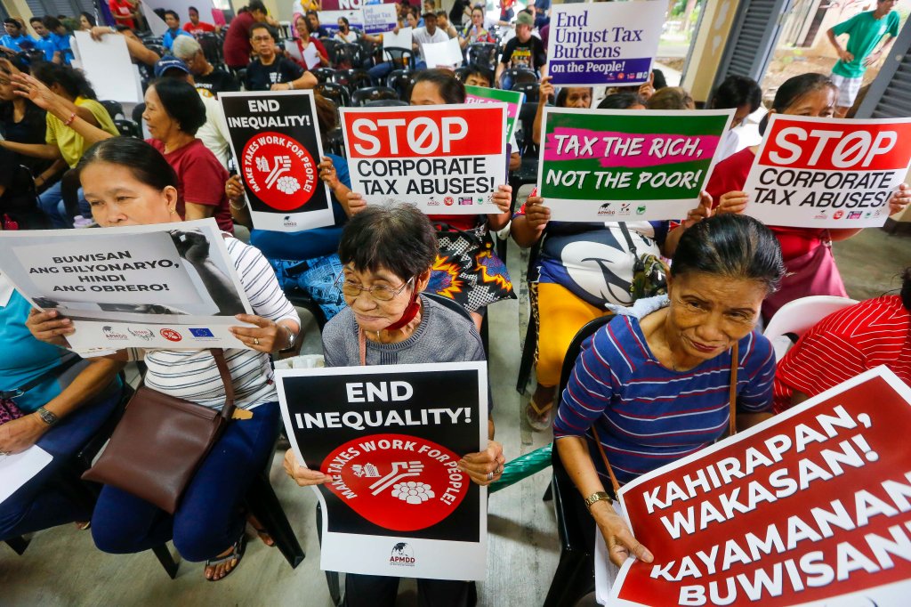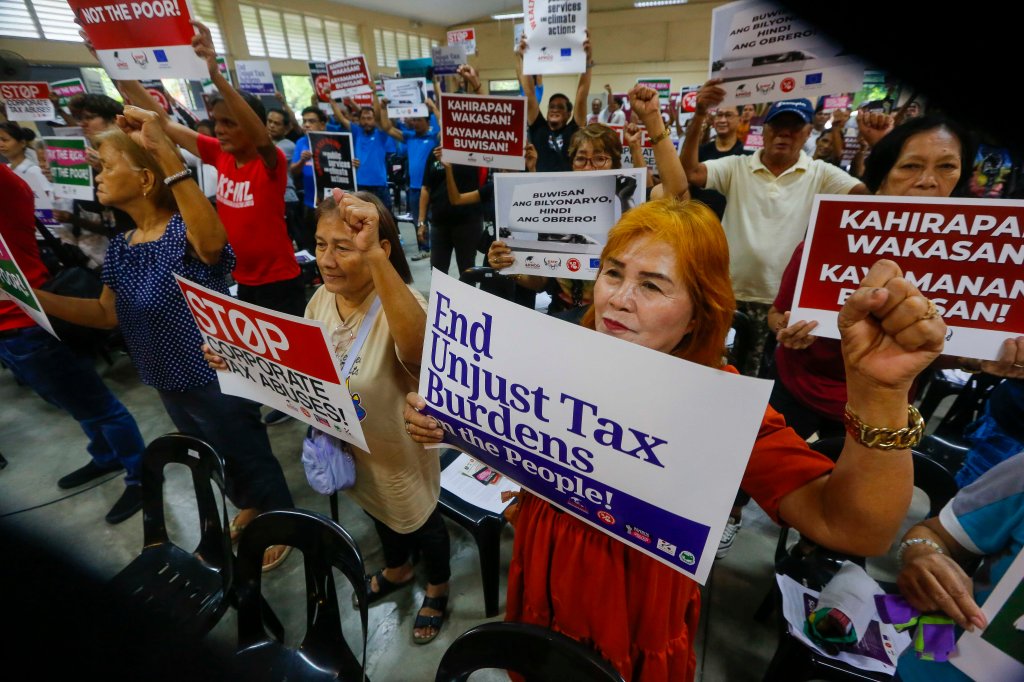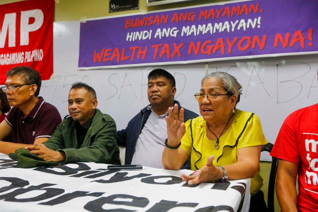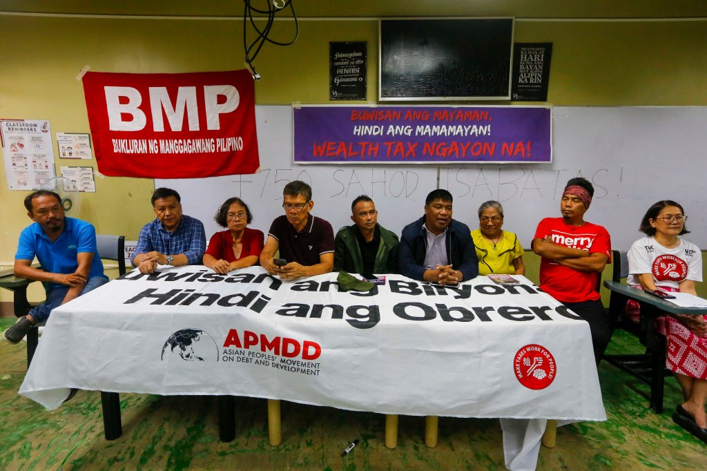 Labor group Bukluran ng Manggagawang Pilipino leads the call for implementation of wealth tax and a 750-peso legislated wage hike during a workers’ forum on wealth tax and press conference at the University of the Philippines Integrated School in Quezon City on June 29, 2024.