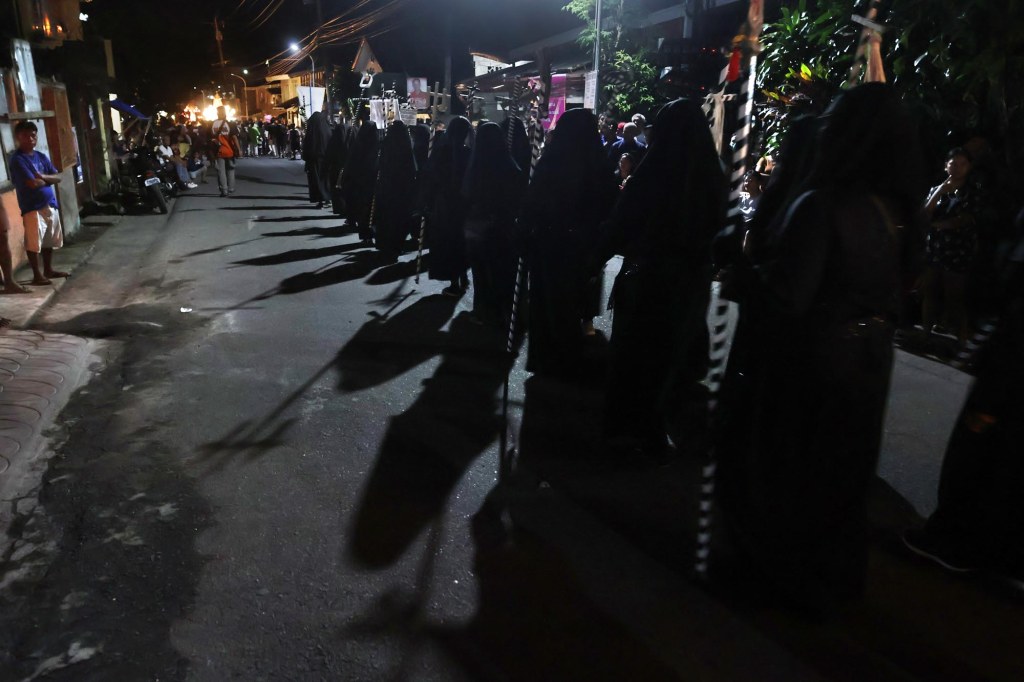 “Sayos” women shrouded in black robes and bearing a stick crucifix, march on the Santo Entierro procession on Good Friday in Buhi, Camarines Sur.