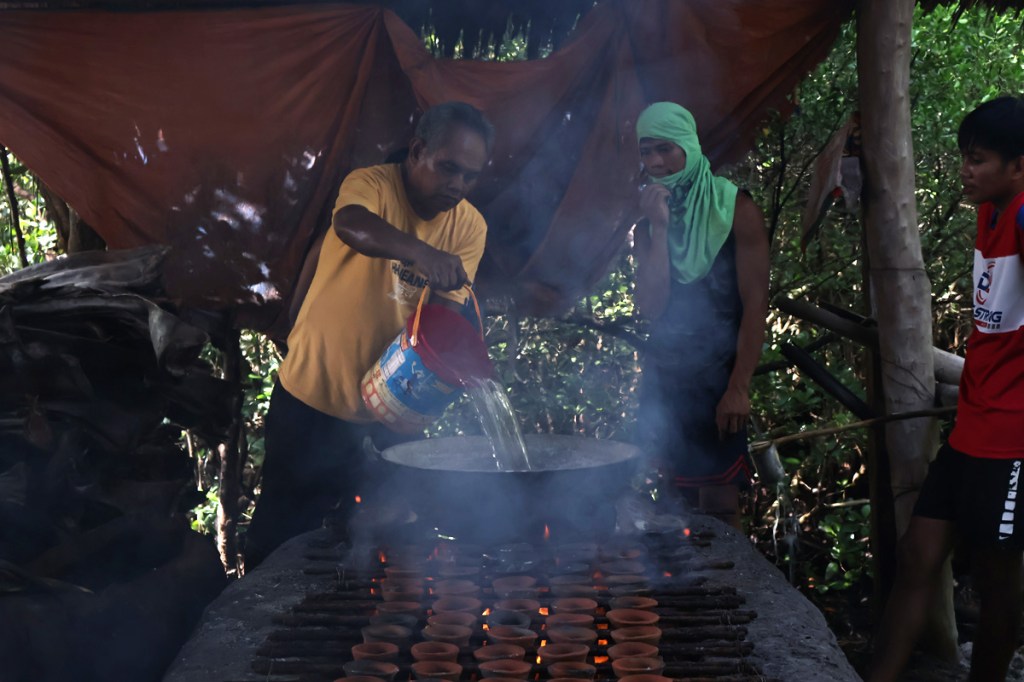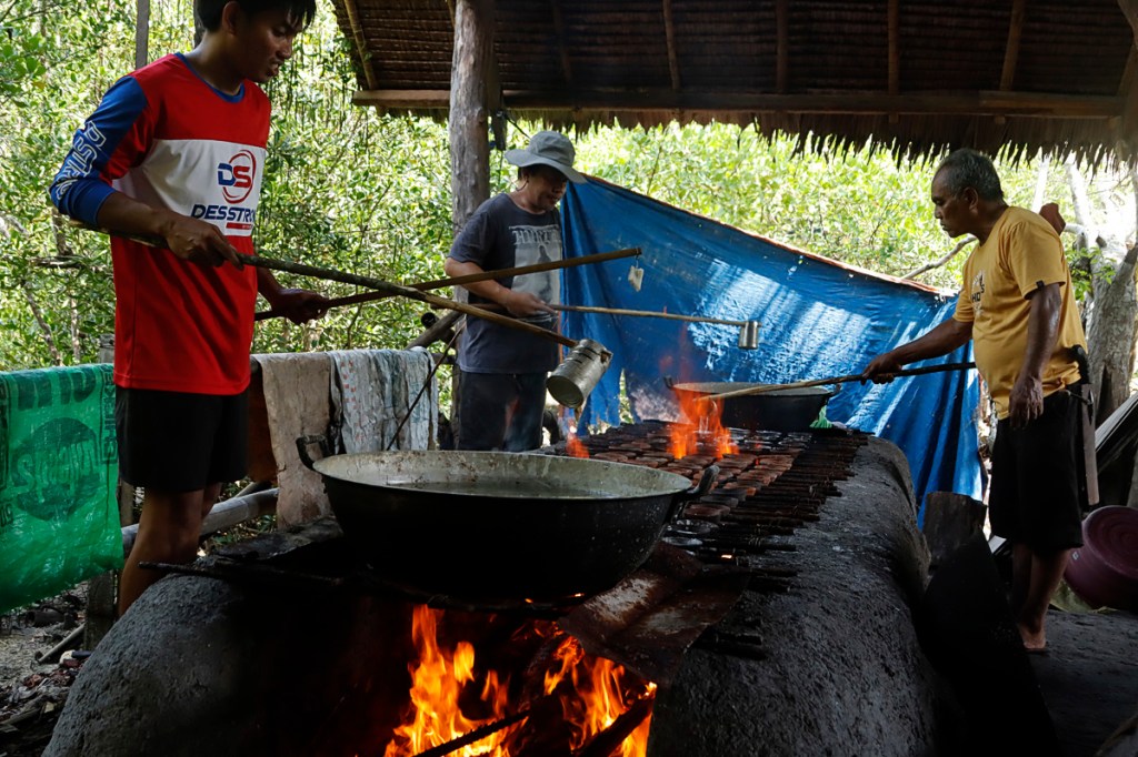 Coconut husks are soaked in seawater for two months in the seaside mangrove area of the Alburquerque-Loay-Loboc Protected Landscape and Seascape. Salt-makers build nipa huts they call “asinan” on the site as crucial in the production.