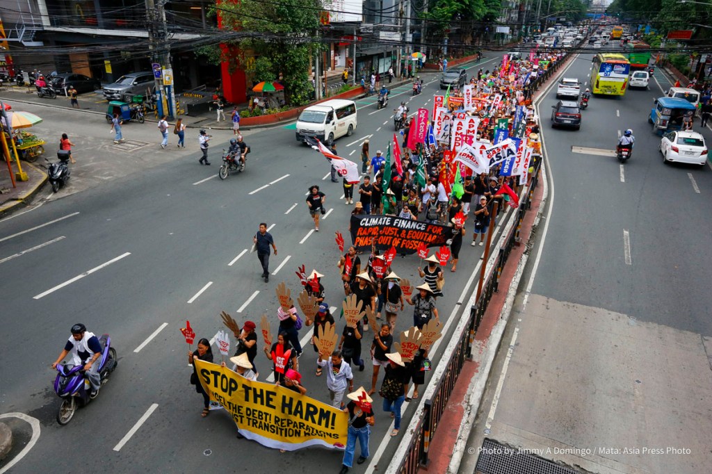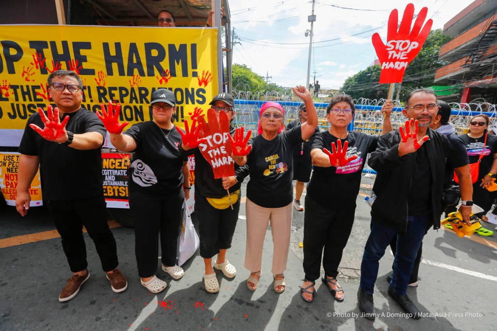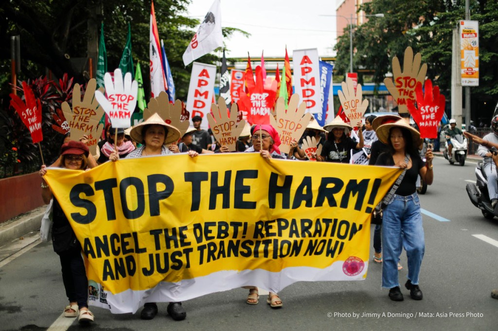Hundreds of activists stage demand “Stop the harm! Cancel the Debt! Reparations and Just Transition Now!” in a protest march in Mendiola, Manila on October 16, 2025.