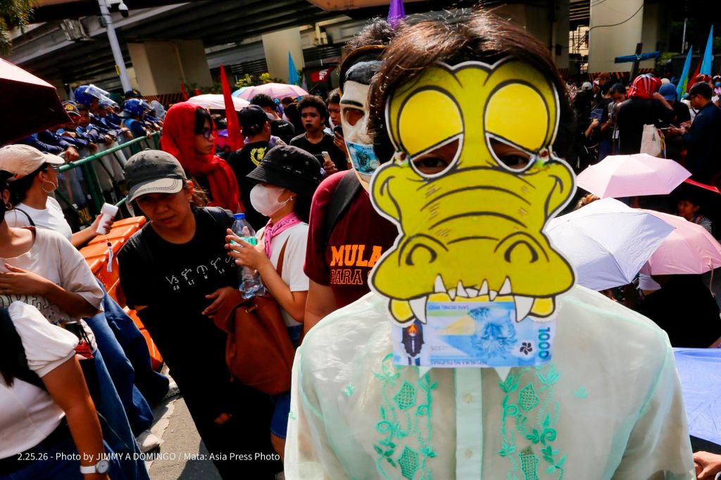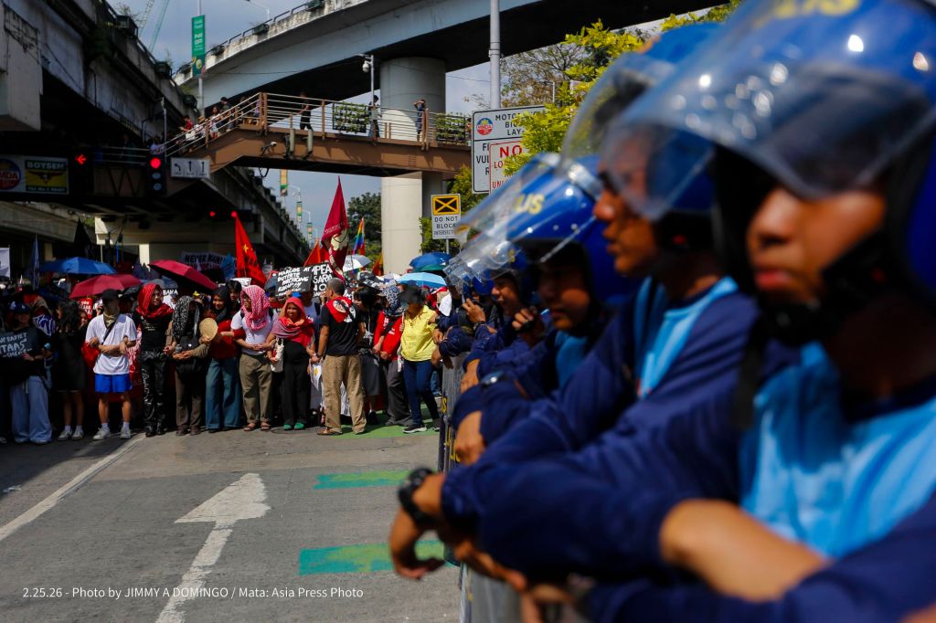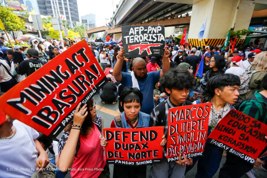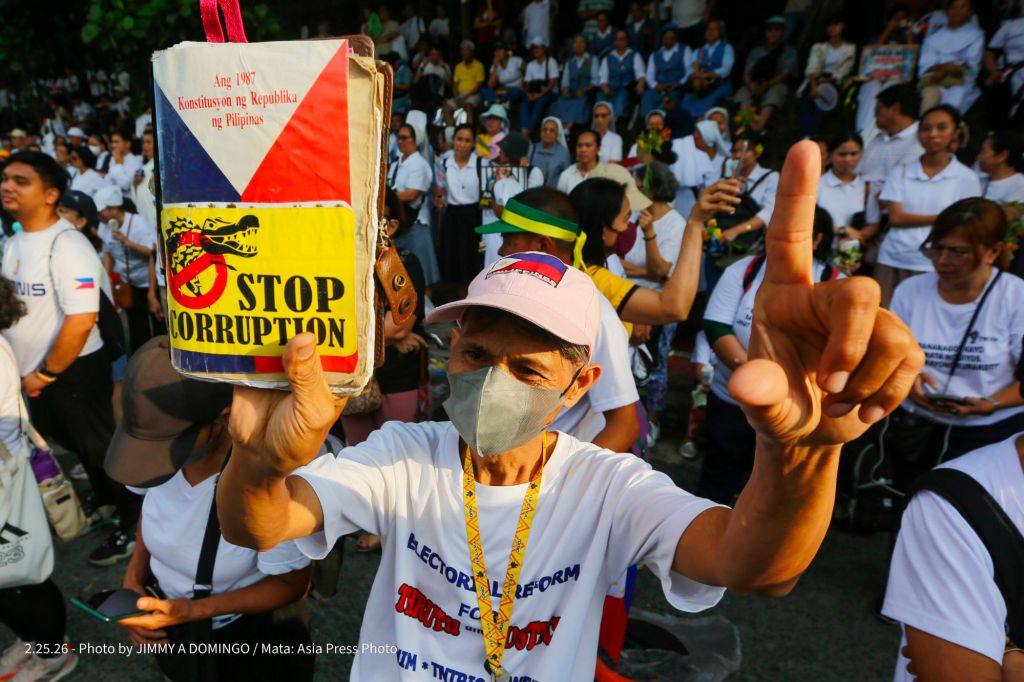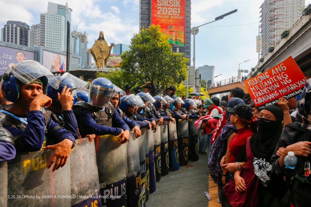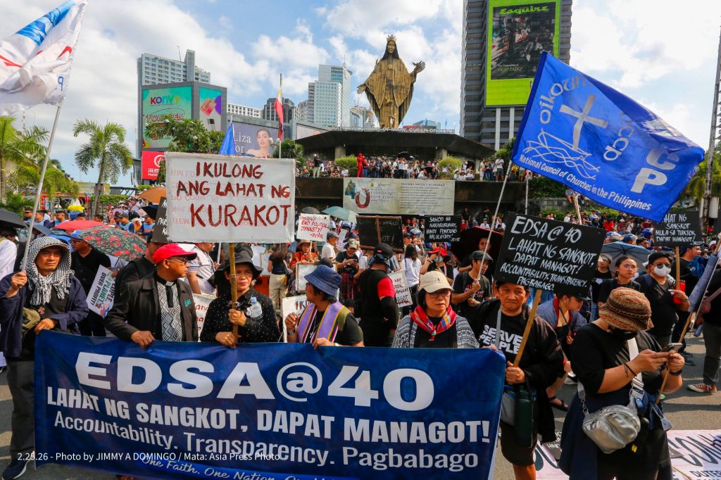 Students, civil society groups, political organizations and religious denominations protest on February 25, 2026 at the EDSA Shrine and People Power Monument in Quezon City, Philippines to commemorate the 40th Anniversary of the 1986 People Power Revolution that toppled the Ferdinand Marcos Sr. dictatorship.