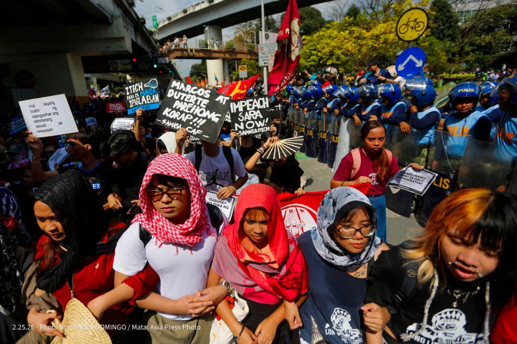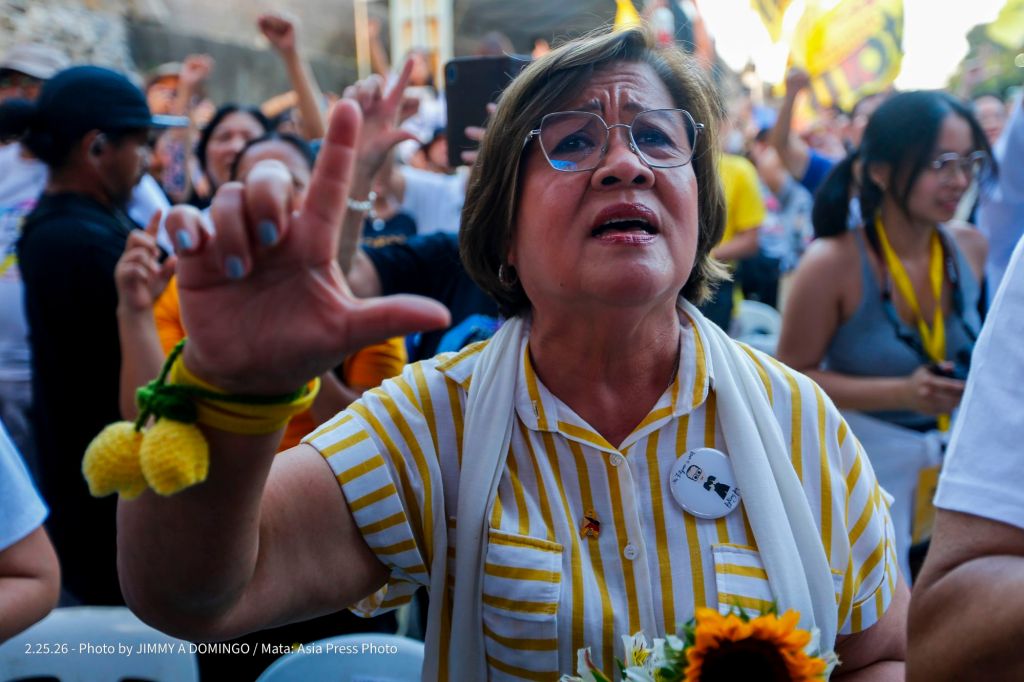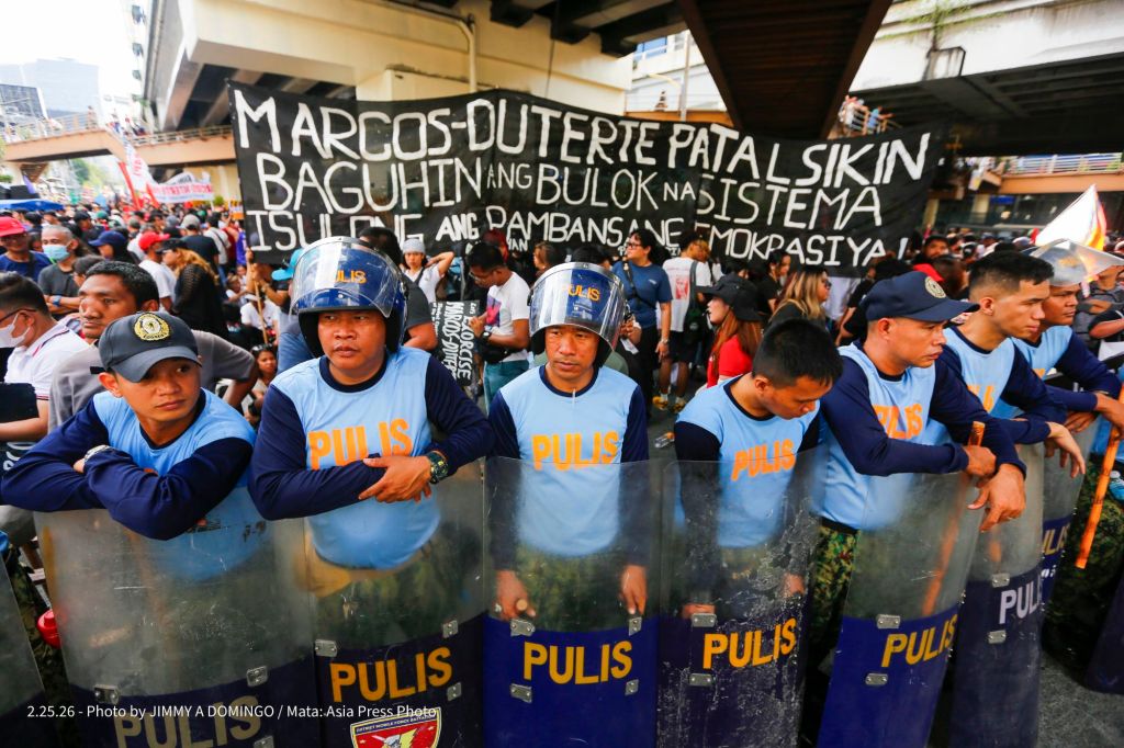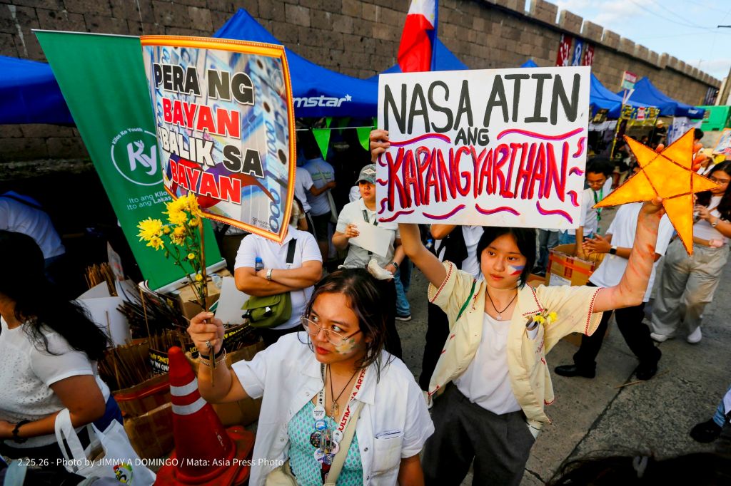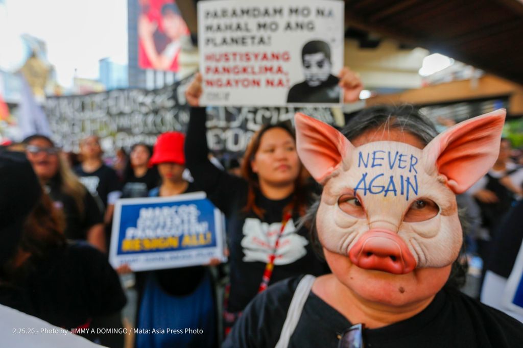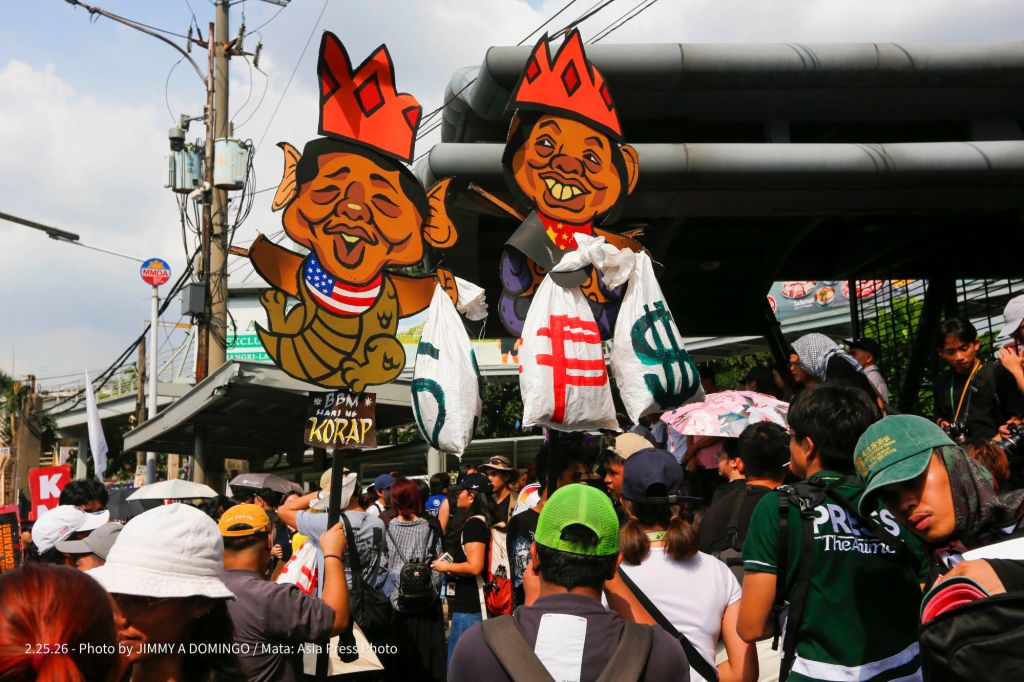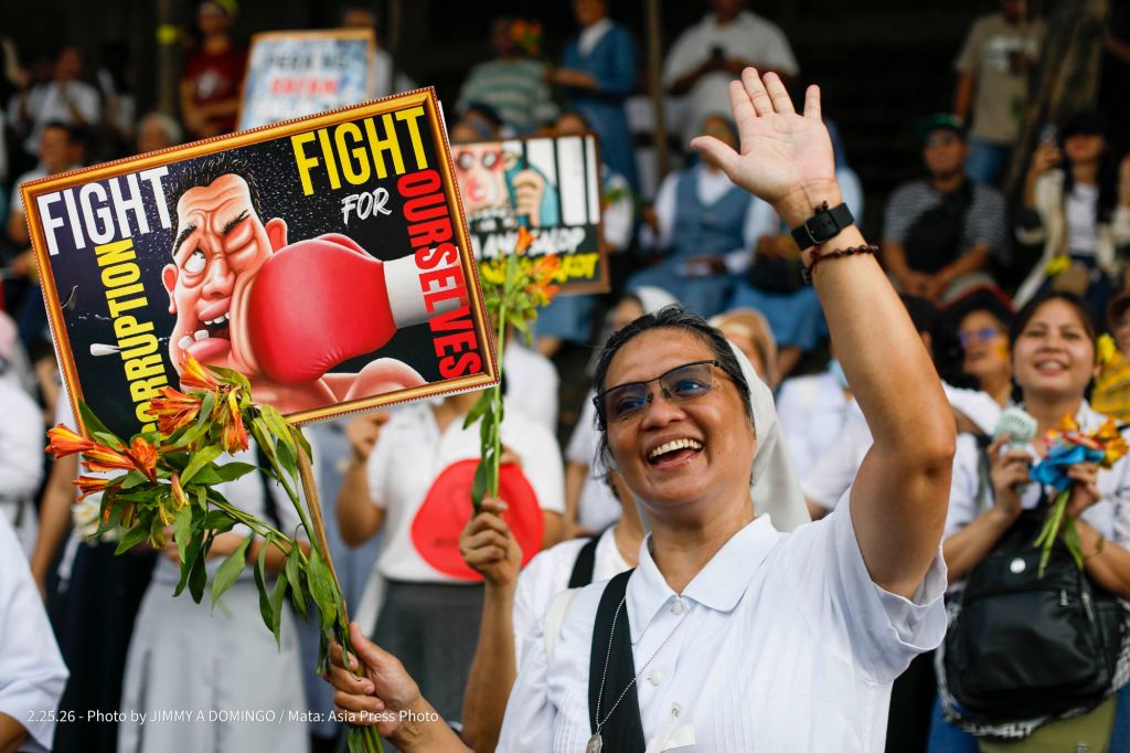 Students, civil society groups, political organizations and religious denominations protest on February 25, 2026 at the EDSA Shrine and People Power Monument in Quezon City, Philippines to commemorate the 40th Anniversary of the 1986 People Power Revolution that toppled the Ferdinand Marcos Sr. dictatorship.