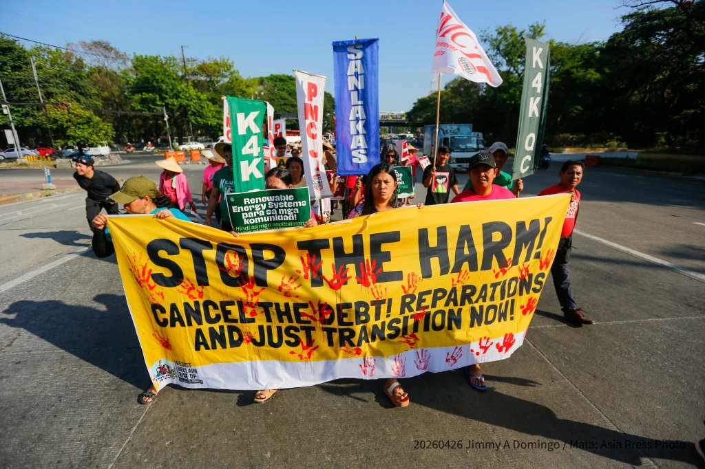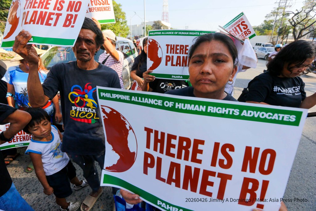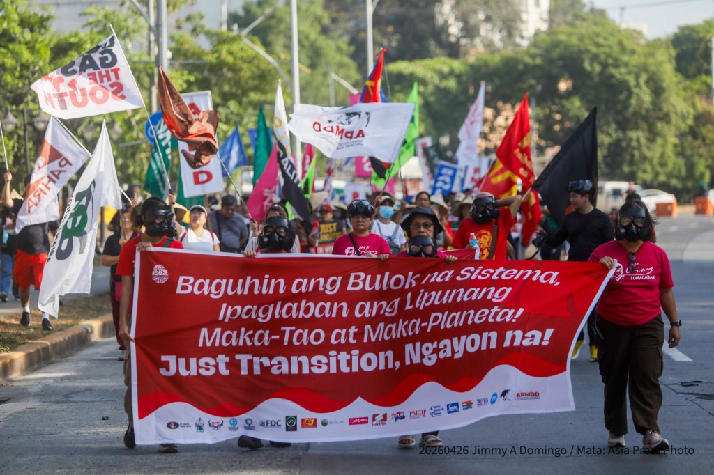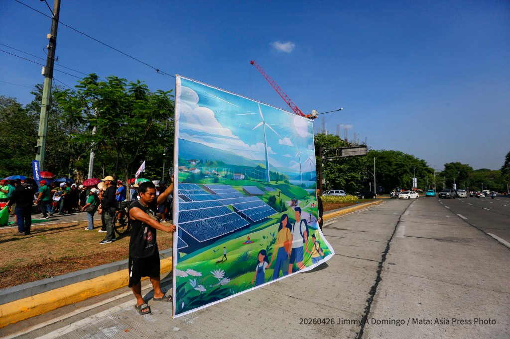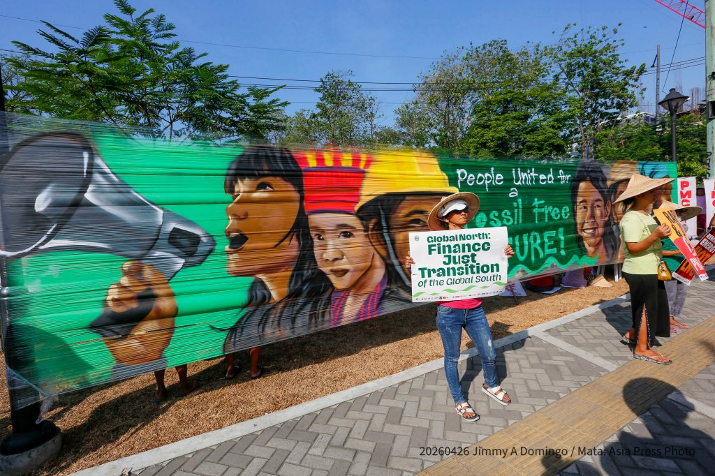 Filipino climate and social justice groups stage a rally in Elliptical Road, Quezon City on April 26, 2026 as part of global demonstrations calling for a rapid, just, and equitable transition to a fossil-free future. The protest is time for the 1st International Conference on Transitioning Away from Fossil Fuels in Santa Marta, Colombia, a historic summit co-hosted by the governments of Colombia and the Netherlands that aims to facilitate the global energy transition.